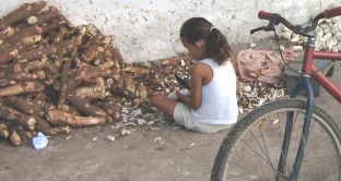 A menina carrega um curativo acima do olho direito, fruto de uma traquinagem infantil, enquanto apostava corrida durante o recreio escolar. Quando perguntada pela reportagem por que, mesmo tão nova, precisa ir trabalhar, sorri timidamente: “Fala com minha mãe, moço”.