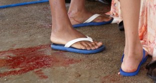 Trabalhador descalço no matadouro. Problemas de saúde e acidentes de trabalho são constantes entre adultos e crianças do setor