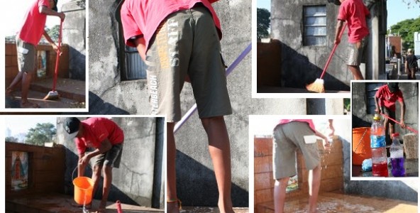 Em seguida, espalha dois tipos de detergentes sobre o local, pega a vassoura e esfrega. Nada escapa, nem mesmo a imagem de Nossa Senhora que adorna o túmulo. Joga um pouco mais de água e começa a tirar o excesso com a ajuda de um rodo. Mais água, mais rodo. Enrola neste um pano de chão com aspecto de recém-comprado e o esfrega na superfície úmida. “Acho que pode jogar mais um pouco de água, não?”, pergunta a senhora que “contratou” o serviço. O menino desce, pega o balde e some novamente.