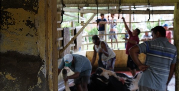Enviado a Lagoa de Pedras (RN) – O boi branco está amarrado pela perna esquerda, com uma corda atada a uma cerca de madeira. São doze homens dentro do matadouro municipal de Lagoa de Pedras, município do interior do Rio Grande do Norte com população estimada em 7.372 pessoas e rebanho de 5.100 bovinos. Duas crianças esperam, trepadas na cerca. O boi hesita. Um dos homens levanta uma marreta e, sem pestanejar, desce ela com toda força na direção da testa do animal.